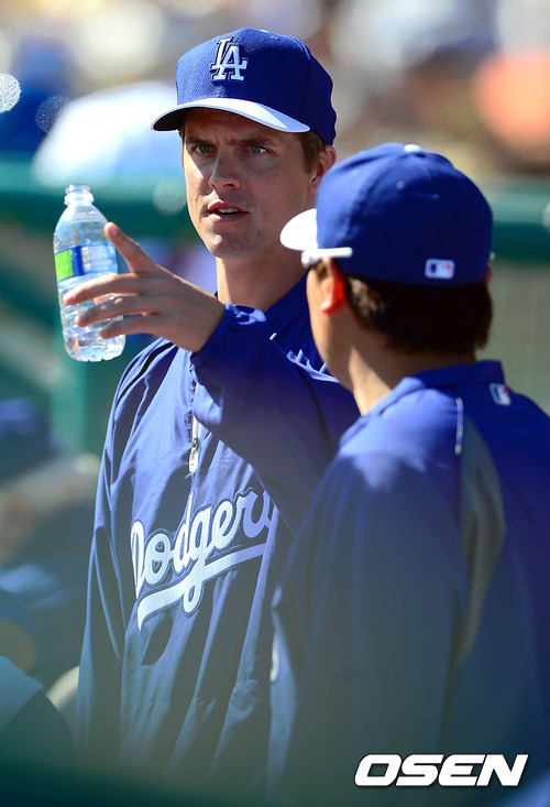 류현진과 잭 그레인키가 이야기를 나누고 있다. MBL 선수들은 같은 리그 팀간의 경기에는 5회까지 더그아웃을 지킨다.