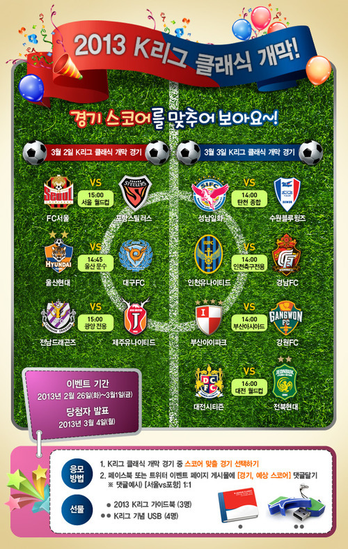 참여 방법은 3월 2일 열리는 서울-포항, 울산-대구, 전남-제주와 3월 3일 성남-수원, 인천-경남, 부산-강원, 대전-전북까지 총 7경기 중 한 경기를 골라 예상 스코어를 K리그 공식 페이스북 또는 트위터 이벤트 페이지에 3월 1일까지 댓글로 남기면 된다. 경기결과를 맞힌 축구팬에게는 추첨을 통해 2013 K리그 오피셜 가이드북(3명), K리그 기념 USB(4명) 등의 다양한 선물이 제공된다.
