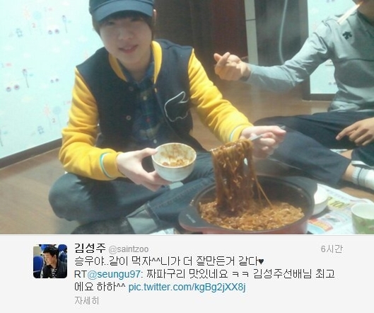 유승우는 지난 25일 자신의 트위터에 "짜파구리 맛있네요. 김성주 선배님 최고에요. 하하"라는 글과 함께 사진을 올렸다.