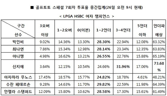 이어 최나연(63.83%), 박인비(63.32%), 안젤라 스탠퍼드(61.49%)의 언더파 예상이 뒤를 이었으며, 아자하라 무노스의 언더파 예상은 48.21%로 비교적 낮게 나타났다.