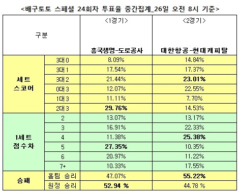 1경기 여자부 경기에서는 5위 흥국생명과 4위 도로공사가 맞붙는 가운데 도로공사 승리(52.94%)가 흥국생명 승리(47.07%)보다 앞서며 도로공사의 승리를 예상했다. 세트 스코어 예상은 2-3의 도로공사 승리(29.76%)가 최다 집계됐다. 1세트 점수차 최다 예상에서는 5점차(27.35%)가 예측됐다.