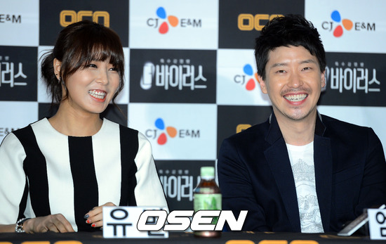 26일 오후 서울 상암 CGV에서 진행된 국내 최초 바이러스 드라마 OCN '더 바이러스'(극본 이명숙/연출 최영수) 제작보고회에서 유빈과 엄기준이 미소짓고 있다.