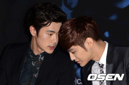 26일 오후 서울 행당동 CGV 왕십리에서 열린 영화 '사이코메트리'(감독 권호영) 언론시사회에서 배우 김강우와 김범이 이야기를 나누고 있다.