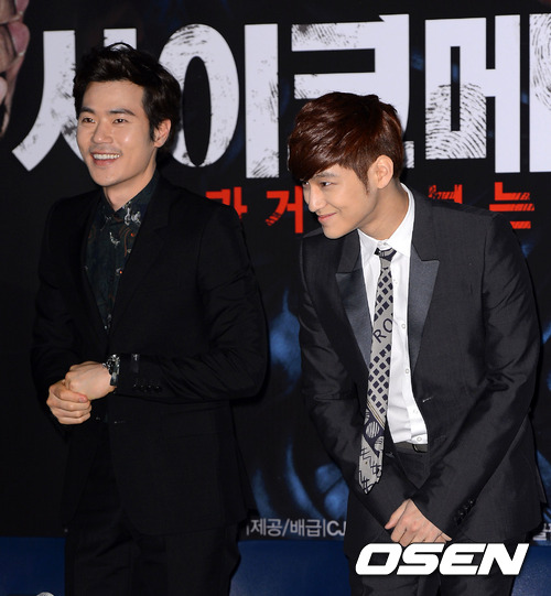 26일 오후 서울 행당동 CGV 왕십리에서 열린 영화 '사이코메트리'(감독 권호영) 언론시사회에서 배우 김강우와 김범이 취재진을 향해 인사를 하고 있다.