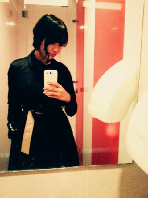 사진 속 수지는 분홍색으로 꾸며진 화장실 거울 앞에서 분홍색 끈이 달린 검정 트렌치 코트를 입고 포즈를 취했다. 검정색 머리와 같은 색의 의상이 화사한 색의 배경과 어울려 소녀같은 분위기를 자아낸다.