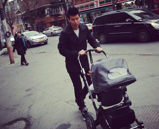 공개된 사진에는 하엘 양이 타고 있는 유모차를 끌고 한가로이 산책을 즐기는 션의 모습이 담겨있다. 션은 유모차 안의 하엘 양을 사랑스러운 눈빛으로 바라보고 있다.