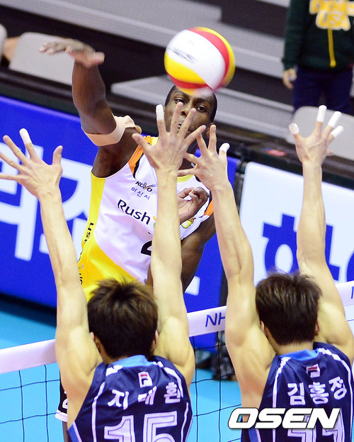 26일 오후 충남 아산시 이순신체육관에서 열린 '2012-2013 NH농협 V-리그' 남자부 아산 러시앤캐시와 대전 삼성화재의 경기 1세트 다미가 공격을 시도하고 있다.