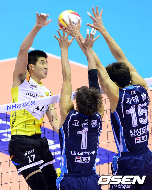 26일 오후 충남 아산시 이순신체육관에서 열린 '2012-2013 NH농협 V-리그' 남자부 아산 러시앤캐시와 대전 삼성화재의 경기 1세트 박상하의 스파이크가 삼성화재 브로킹에 막히고 있다.