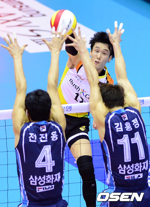 26일 오후 충남 아산시 이순신체육관에서 열린 '2012-2013 NH농협 V-리그' 남자부 아산 러시앤캐시와 대전 삼성화재의 경기 1세트 최홍석이 공격을 시도하고 있다.