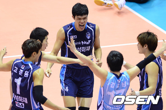 26일 오후 충남 아산시 이순신체육관에서 열린 '2012-2013 NH농협 V-리그' 남자부 아산 러시앤캐시와 대전 삼성화재의 경기 1세트 삼성화재 전진용이 브로킹에 성공 후 환호하고 있다.