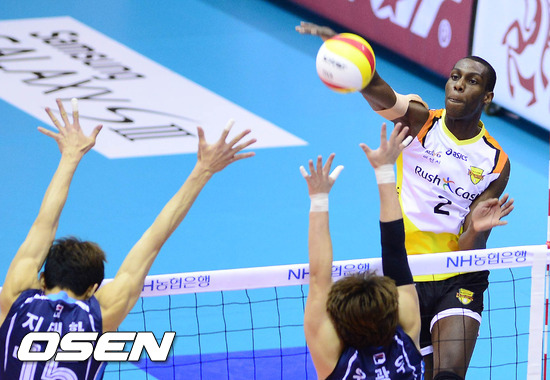 26일 오후 충남 아산시 이순신체육관에서 열린 '2012-2013 NH농협 V-리그' 남자부 아산 러시앤캐시와 대전 삼성화재의 경기 1세트 다미가 공격을 시도하고 있다.