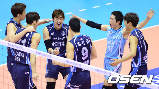 26일 오후 충남 아산시 이순신체육관에서 열린 '2012-2013 NH농협 V-리그' 남자부 아산 러시앤캐시와 대전 삼성화재의 경기 2세트 삼성화재 선수들이 득점 후 기뻐하고 있다.
