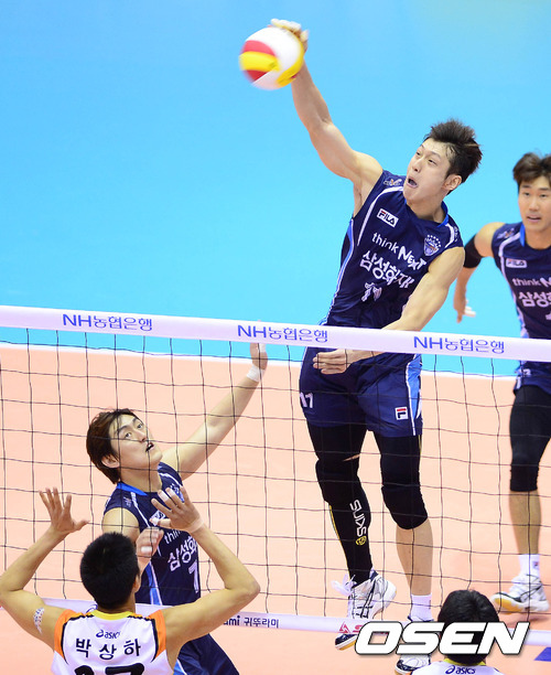 26일 오후 충남 아산시 이순신체육관에서 열린 '2012-2013 NH농협 V-리그' 남자부 아산 러시앤캐시와 대전 삼성화재의 경기 2세트 김홍정이 공격을 시도하고 있다.