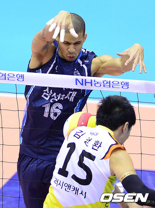 26일 오후 충남 아산시 이순신체육관에서 열린 '2012-2013 NH농협 V-리그' 남자부 아산 러시앤캐시와 대전 삼성화재의 경기 2세트 삼성화재 레오가 김정환의 공격을 브로킹하고 있다.