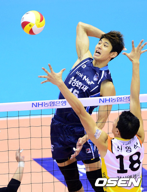 26일 오후 충남 아산시 이순신체육관에서 열린 '2012-2013 NH농협 V-리그' 남자부 아산 러시앤캐시와 대전 삼성화재의 경기 2세트 지태환이 공격을 시도하고 있다.