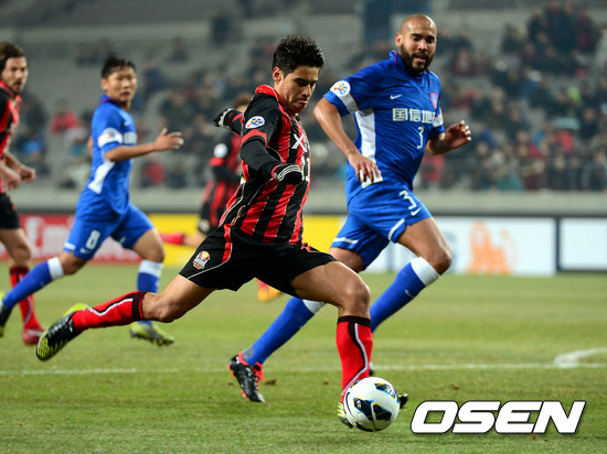 26일 오후 서울월드컵경기장에서 열린 '2013 아시아축구연맹(AFC) 챔피언스리그 조별리그 1차전' FC 서울과 장쑤 순톈의 경기 전반 FC서울 몰리나가 슈팅을 때리고 있다.