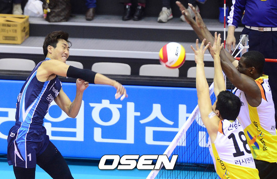 26일 오후 충남 아산시 이순신체육관에서 열린 '2012-2013 NH농협 V-리그' 남자부 아산 러시앤캐시와 대전 삼성화재의 경기 4세트 고준용의 공격이 브로킹에 막히고 있다.
