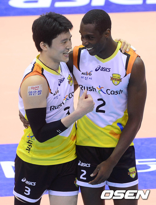 26일 오후 충남 아산시 이순신체육관에서 열린 '2012-2013 NH농협 V-리그' 남자부 아산 러시앤캐시와 대전 삼성화재의 경기 4세트 종료 후 러시앤캐시 안준찬과 다미가 기뻐하며 벤치로 향하고 있다.