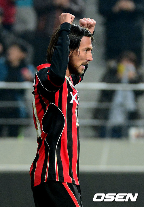 26일 오후 서울월드컵경기장에서 열린 '2013 아시아축구연맹(AFC) 챔피언스리그 조별리그 1차전' FC 서울과 장쑤 순톈의 경기 후반 FC서울 데얀이 추가골을 넣고 기뻐하고 있다.
