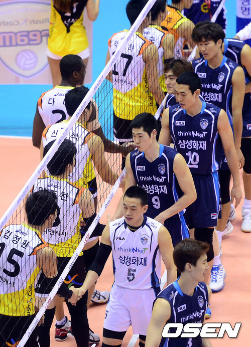 26일 오후 충남 아산시 이순신체육관에서 열린 '2012-2013 NH농협 V-리그' 남자부 아산 러시앤캐시와 대전 삼성화재의 경기 종료 후 선수들이 악수를 나누고 있다.