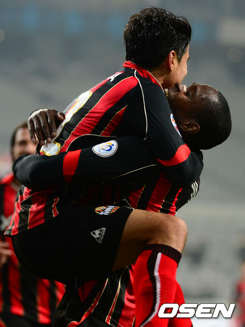 26일 오후 서울월드컵경기장에서 열린 '2013 아시아축구연맹(AFC) 챔피언스리그 조별리그 1차전' FC 서울과 장쑤 순톈의 경기 후반 FC서울 몰리나가 추가골을 넣고 아디와 기뻐하고 있다.