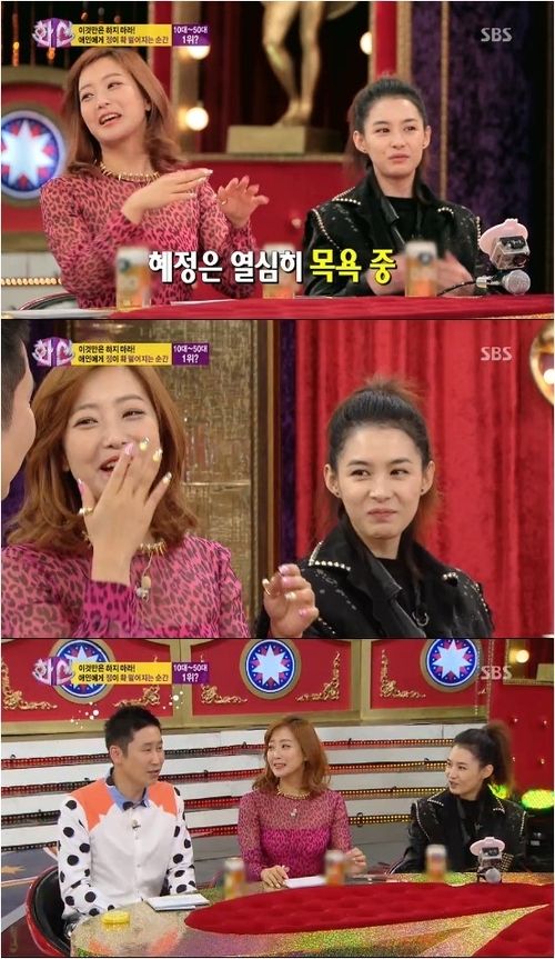 이어 그는 “만약에 내가 다 벗고 있었으면 민망해서 피했을 텐데 혜정 씨는 참 착하다”면서 “90도로 인사를 했다”고 털어놨다. 당시 강혜정을 때를 밀고 있었다고. 강혜정은 “때가 묻은 채 인사를 했다”고 말해 웃음을 자아냈다.