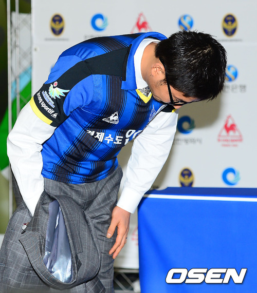 이천수가 기자회견을 마치고 고개를 숙이고 있다.