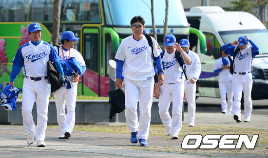 류중일 감독을 비롯한 코칭스태프가 경기장에 들어서고 있다.