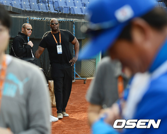 MLB 사무국에서 파견된 사복 경찰이 류중일 감독을 바라보고 있다.