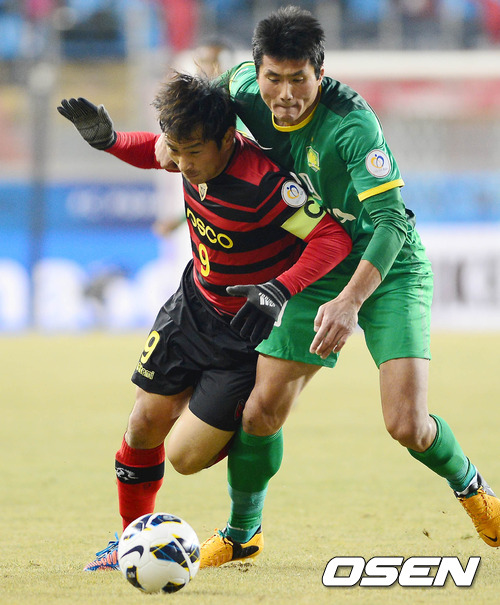 27일 오후 경북 포항시 포항 스틸야드에서 열린 '2013 아시아축구연맹(AFC) 챔피언스리그 조별리그 1차전' 포항 스틸러스와 베이징 궈안의 경기 전반 황지수가 볼다툼을 하고 있다.