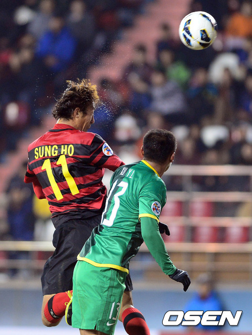 27일 오후 경북 포항시 포항 스틸야드에서 열린 '2013 아시아축구연맹(AFC) 챔피언스리그 조별리그 1차전' 포항 스틸러스와 베이징 궈안의 경기 전반 박성호가 문전에서 헤딩슛을 시도하고 있다.