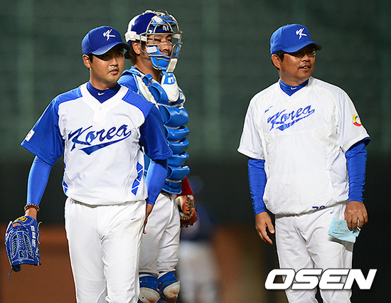 3회초 2사 1루에서 대표팀 선발 장원삼이 마운드를 내려오고 있다.