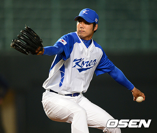 3회초 2사 1루에서 대표팀 장원준이 장원삼에 이어 마운드에 올라 역투하고 있다.