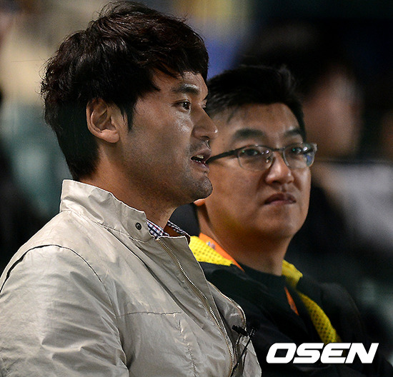 해설자로 변신한 박찬호가 경기를 관전하고 있다.