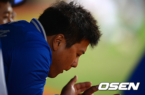 김태균이 더그아웃에서 경기를 지켜보고 있다.