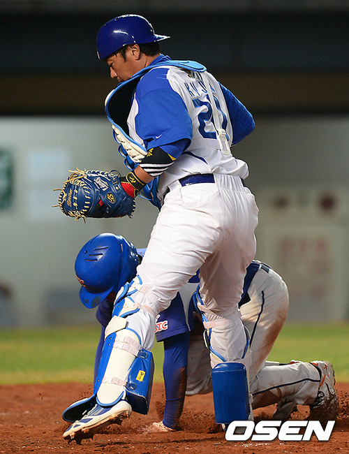 7회초 1사 1,2루에서 대만 군인선발팀 팡창용의 1타점 좌전 적시타에 린허가 대표팀 진갑용의 태그에 앞서 세이프되고 있다.