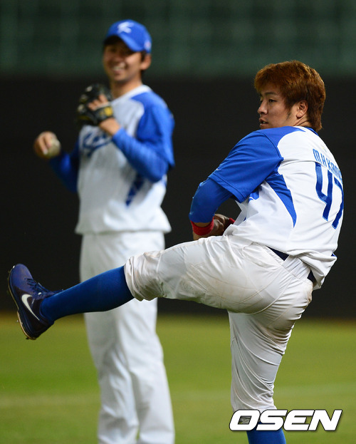 8회초 대표팀 강민호가 불펜에서 몸을 푸는 윤희상과 장난을 치고 있다./jpnews@osen.co.kr