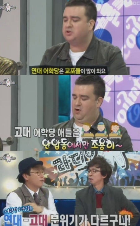 또 샘 해밍턴은 “고대 어학당 학생들은 진지하다. 연대 어학당 학생들은 날라리다. 교포 친구들이 많다. 맨날 홍대에 가서 술을 마신다. 고대 친구들은 안암리에서만 있다”며 라이벌 의식을 드러내 웃음을 자아냈다.