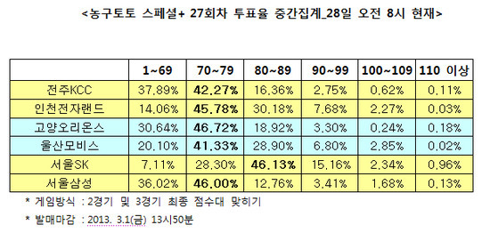 국내 프로농구(KBL) 3경기 대상 농구토토 스페셜+ 27회차 투표율 중간집계 결과