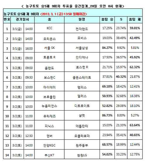농구토토 승5패 9회차 투표율 중간 집계 결과