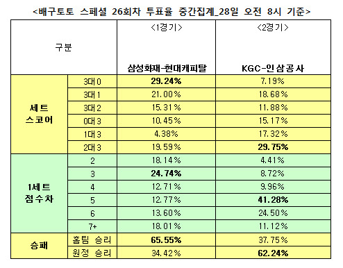 국민체육진흥공단(www.kspo.or.kr)이 발행하는 체육진흥투표권 수탁사업자인 스포츠토토 공식 온라인 발매사이트 베트맨(www.betman.co.kr)이 오는 1일 대전충무체육관에서 열리는 2012-13시즌 국내프로배구(V리그)를 대상으로 한 배구토토 스페셜 26회차 투표율 중간집계 결과, 삼성화재-현대캐피탈(1경기)전에서 국내 배구팬 65.55%가 삼성화재의 승리를 예상했다고 밝혔다.