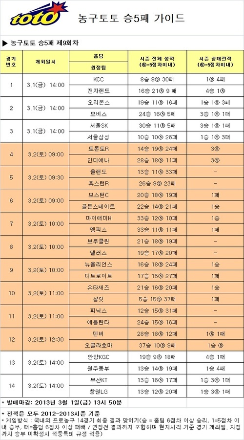 한편 서울라이벌 서울SK-서울삼성(3경기)전에서는 참가자들의 84.27%가 선두 서울SK의 6점차 이상 승리를 예상했으며, 안양KGC-원주동부(13경기)전에서는 68.57%가 안양KGC의 6점차 이상 승리를 전망했다. 한편 농구토토 승5패 9회차 게임은 오는 1일 오후 1시 50분에 발매가 마감된다.