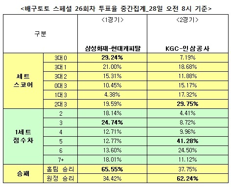 [배구토토] 국민체육진흥공단(www.kspo.or.kr)이 발행하는 체육진흥투표권 수탁사업자인 스포츠토토 공식 온라인 발매사이트 베트맨(www.betman.co.kr)이 내달 1일 대전충무체육관에서 열리는 2012-13시즌 국내프로배구(V리그)를 대상으로 한 배구토토 스페셜 26회차 투표율 중간집계 결과, 삼성화재-현대캐피탈(1경기)전에서 국내 배구팬 65.55%가 삼성화재의 승리를 예상했다고 밝혔다.