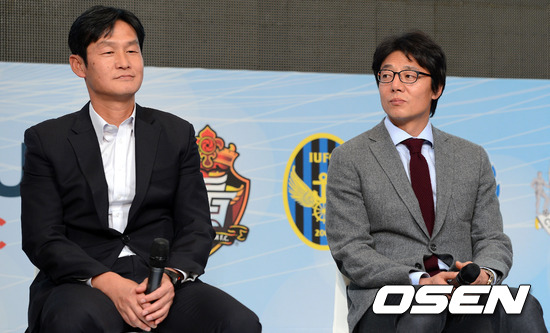 28일 오후 서울 홍은동 그랜드힐튼호텔 그랜드볼룸에서 열린 '2013 K리그 클래식 미디어데이'에서 서울 최용수 감독과 포항 황선홍 감독이 취재진의 질문을 듣고 있다.