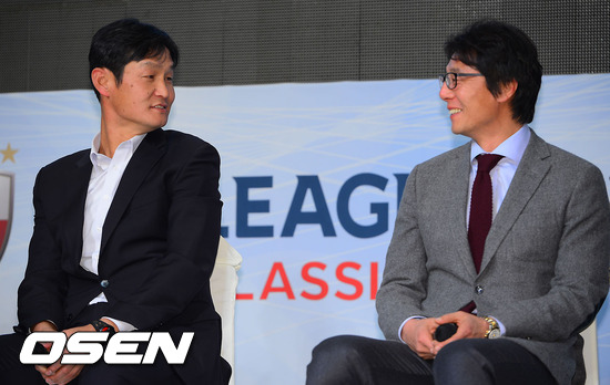 28일 오후 서울 홍은동 그랜드힐튼호텔 그랜드볼룸에서 열린 '2013 K리그 클래식 미디어데이'에서 최용수 감독과 황선홍 감독이 서로 바라보고 있다
