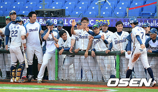 9회초 1사 3루에서 NC 조영훈의 적시타에 홈을 밟은 박민우가 더그아웃에서 동료선수들과 하이파이브를 하고 있다./jpnews@osen.co.kr