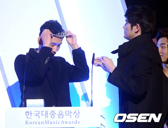 28일 오후 서울 광장동 유니클로 악스홀에서 열린 '제10회 한국대중음악상' 시상식에서 '최우수 록 음반'을 수상한 정차식이 장기하로부터 티아라를 선물받고 있다.