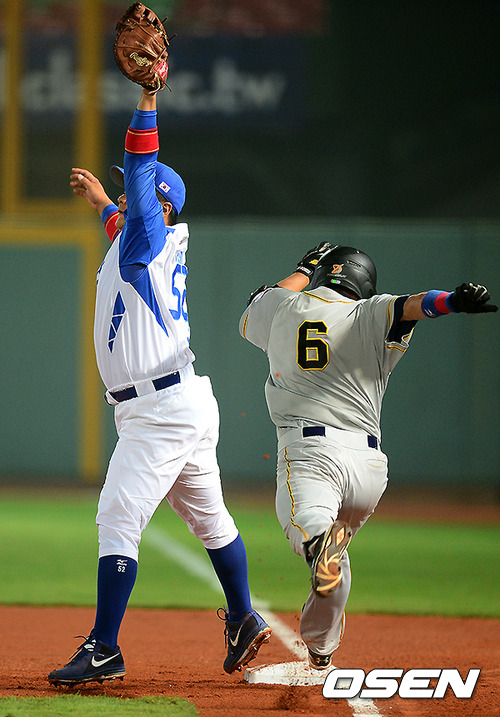 1회초 1사에서 대표팀 김태균이 대만 린웨이팅의 내야땅볼에 1루에서 아웃시키고 있다.