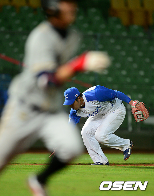 3회초 1사 3루에서 대표팀 최정이 송승준에 맞고 굴절된 타구를 처리하고 있다. 대만 샤오보팅은 내야안타로 출루하며 타점에 성공.