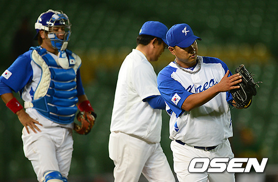 4회초 2사에서 대표팀 송승준이 차우찬에 마운드를 넘기고 있다.